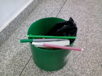 1.Você e sua equipe devem escolher três objetos de seu cotidiano. Vale tudo: caneta, lápis, borracha, giz, caderno... Basta que sejam coisas concretas e façam parte do seu dia a dia. Coloque-as dentro de um balde, que vai guardar esses objetos até o fim das atividades.