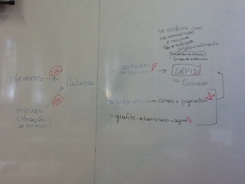 Pesquisamos e montamos o ciclo de vida do lápis, do caderno e da garrafa pet. Montamos um esquema no quadro e postarei aqui as fotos.